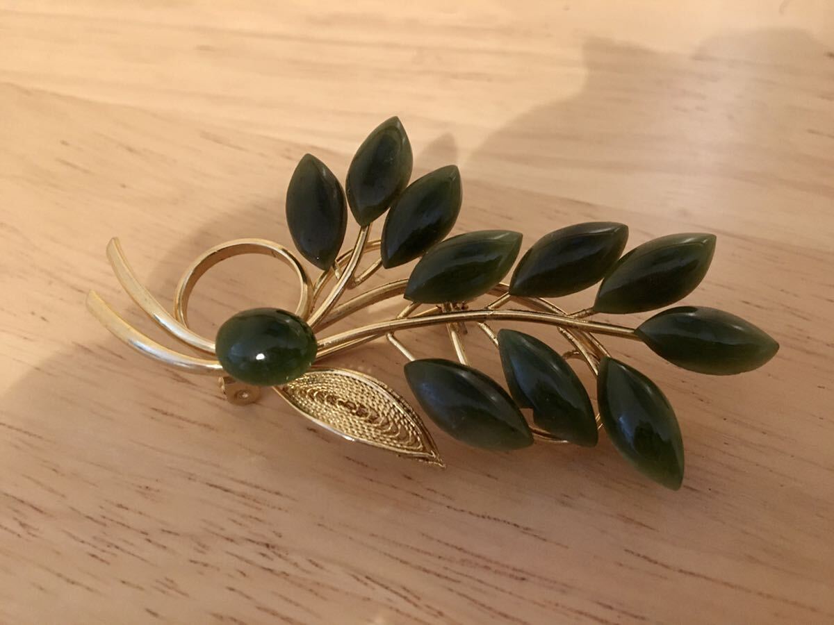 - ビンテージ ブローチ レトロ ヒスイ? 天然石 葉っぱ 木