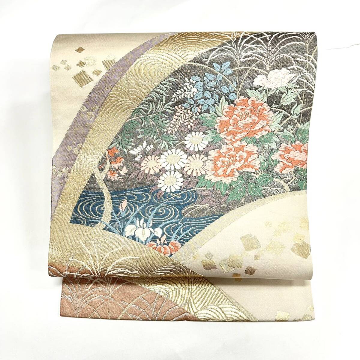 - 【七福】c75 正絹 袋帯 六通 太鼓柄 フォーマル 金糸 銀糸 豪華 古典柄 正倉院紋様 長さ 約416cm 留袖 訪問着 色無地