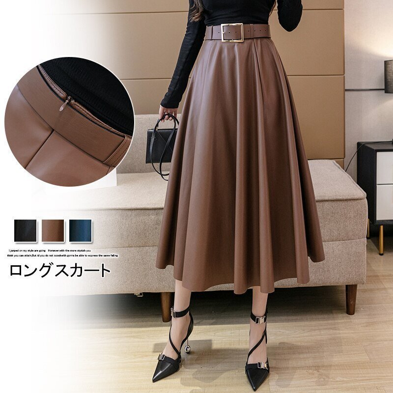 - LB761 レザー スカート レディース PU Aライン ミモレ丈 ベルト 付き レディース 秋冬 ハイウエストミッドレングス /S~XLサイズ