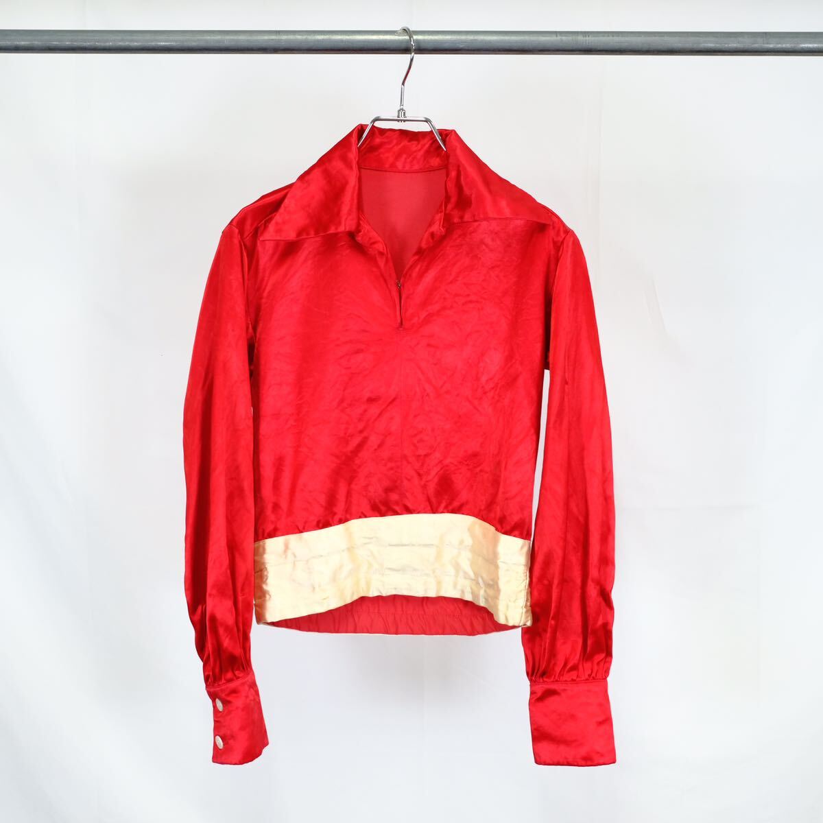 - 【1960s】ビンテージ コスチュームドレス シャツジャケット 赤 サテン 古着 赤 ドイツ製 ユーロ 舞台衣装 シルク