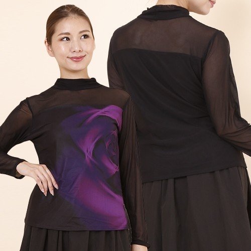 - 新品◎社交ダンストップス ◎絵画風薔薇プリントが 素敵 黒 ブラックXパープル 普段にも