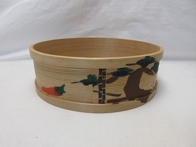 - M604366 【 美品 茶道具 柴田玉樹 博多曲物 杉木地 炭斗 松 梅 鶴 亀蒔絵 底サイン 作者不明 箱無 】 検) 柴田德商店 福岡の伝統文化 ⅱ