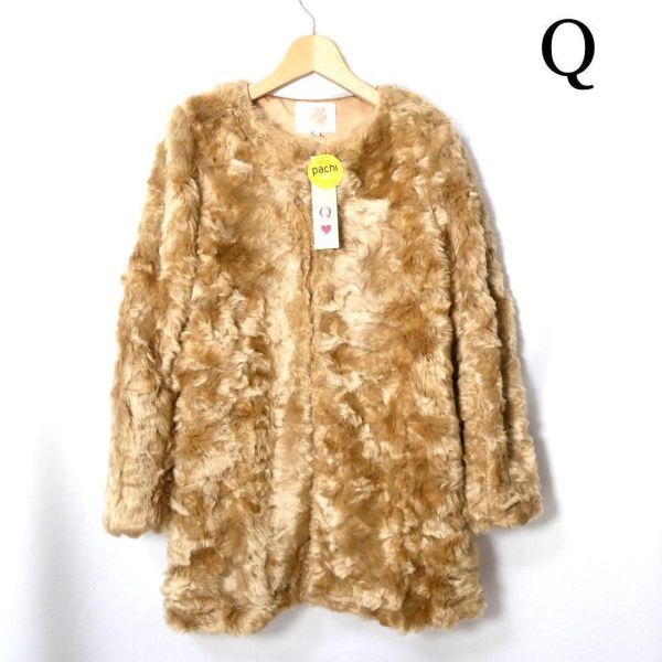 > 新品 未使用 タグ付き Q キュー サイズ2 M ファー カギフック ノーカラーコート ロングコート ムートンコート ベージュ ブラウン