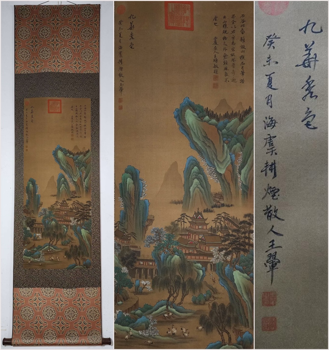 - 古美術 掛け軸 中国・清時代 「耕煙散人書」 絹本 【青緑山水図】 立軸 書道 巻き物 真筆逸品 肉筆保証 唐物 古画 LT-24506