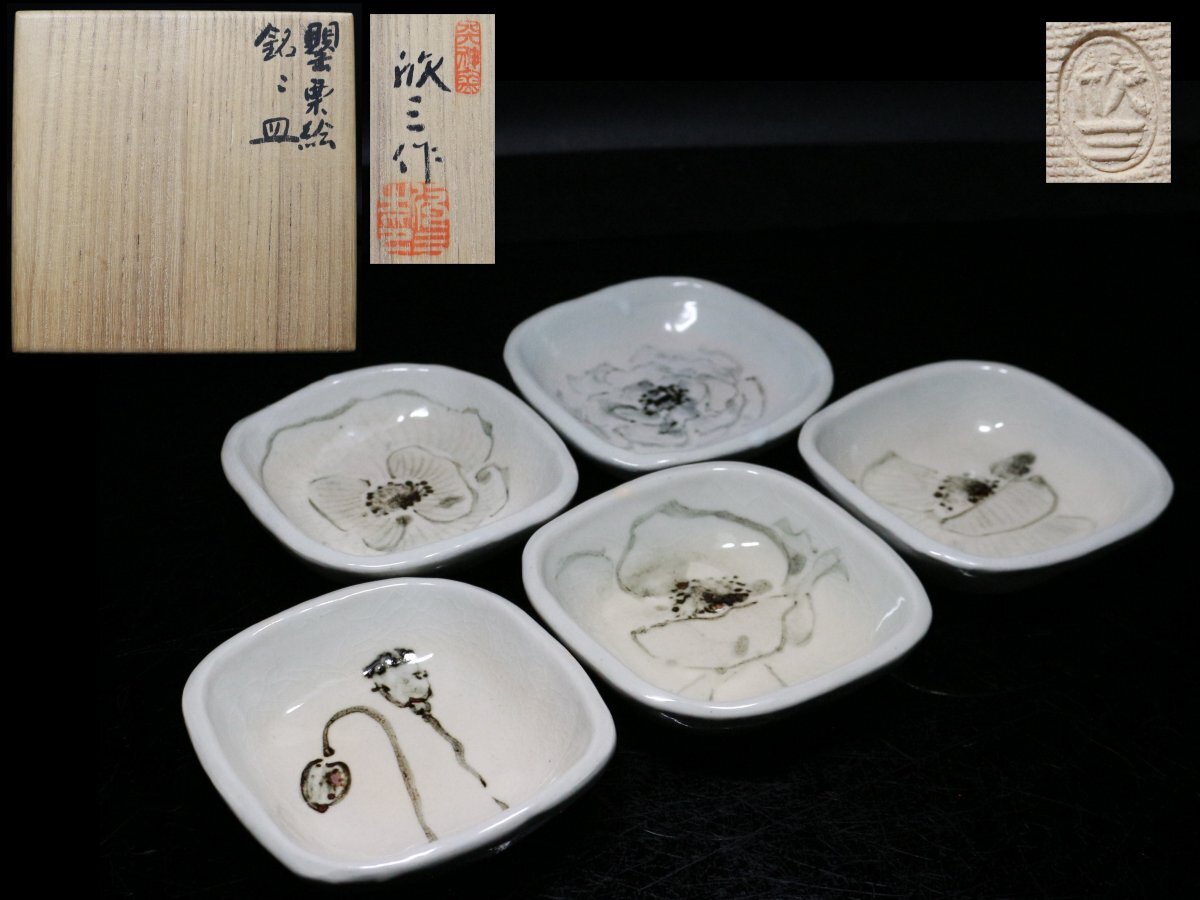 - ◆天神窯・岡本欣三・罌栗絵・絵変り・銘々皿・飾り皿・栞・共布・共箱◆aaa363