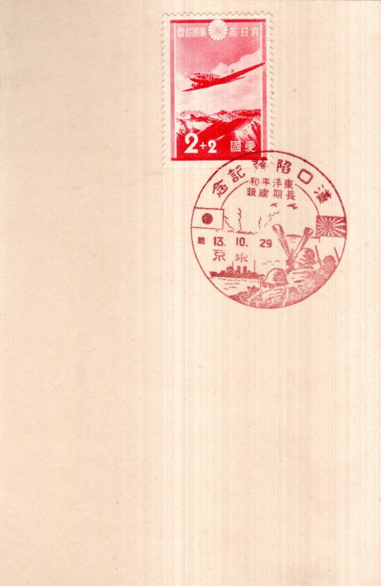 - 郵便はかき 2+2銭愛国切手飛行機 昭和13年10月29日漢口陥落紀念東洋平和長期建設東京 記念切手貼付葉書