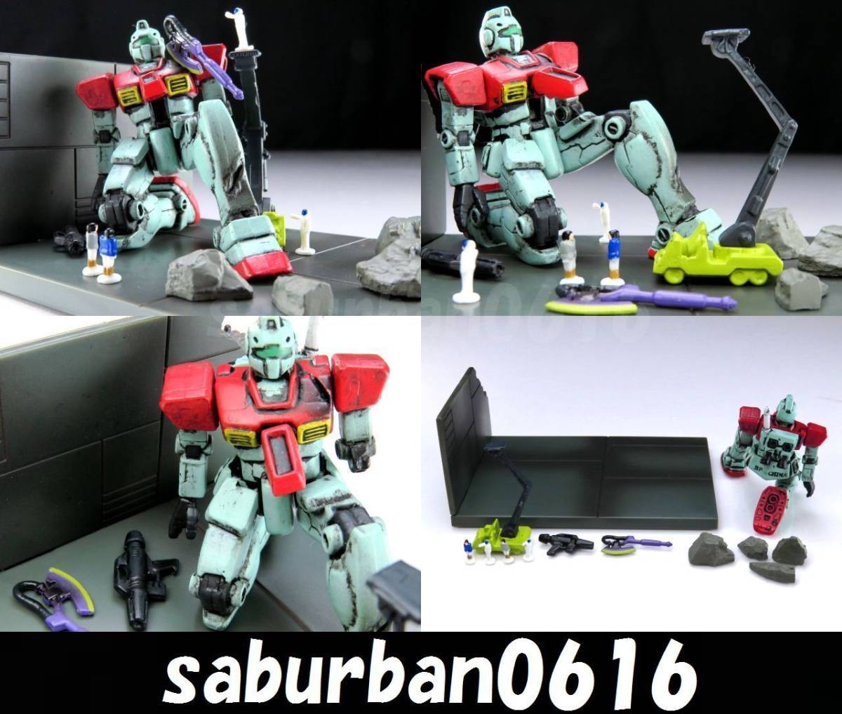 - G0508 1st ジム RGM-79 軍人 クレーン ジオラマ 基地 ファースト 0079 初代 ウェザリング 汚れ 汚し 塗装済 完成品 ダメージ 破壊 修復演出