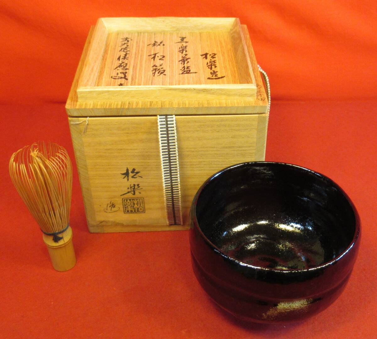 - 茶道具 積應和尚書付『黒楽茶碗 銘「松籟」在銘「松楽造」(佐々木松楽)共箱 如拙庵』検:茶事 七事式 表千家 裏千家 武者小路千家 千家十職