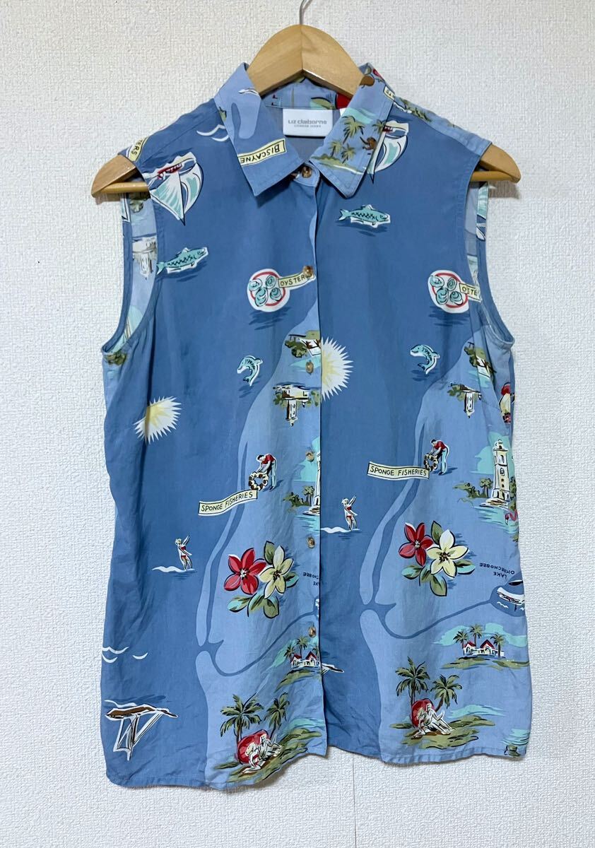 > 90’s Liz claiborne リズクレイボーン 総柄 ハワイアン 100%シルク ノースリーブ ヴィンテージ サイズ M