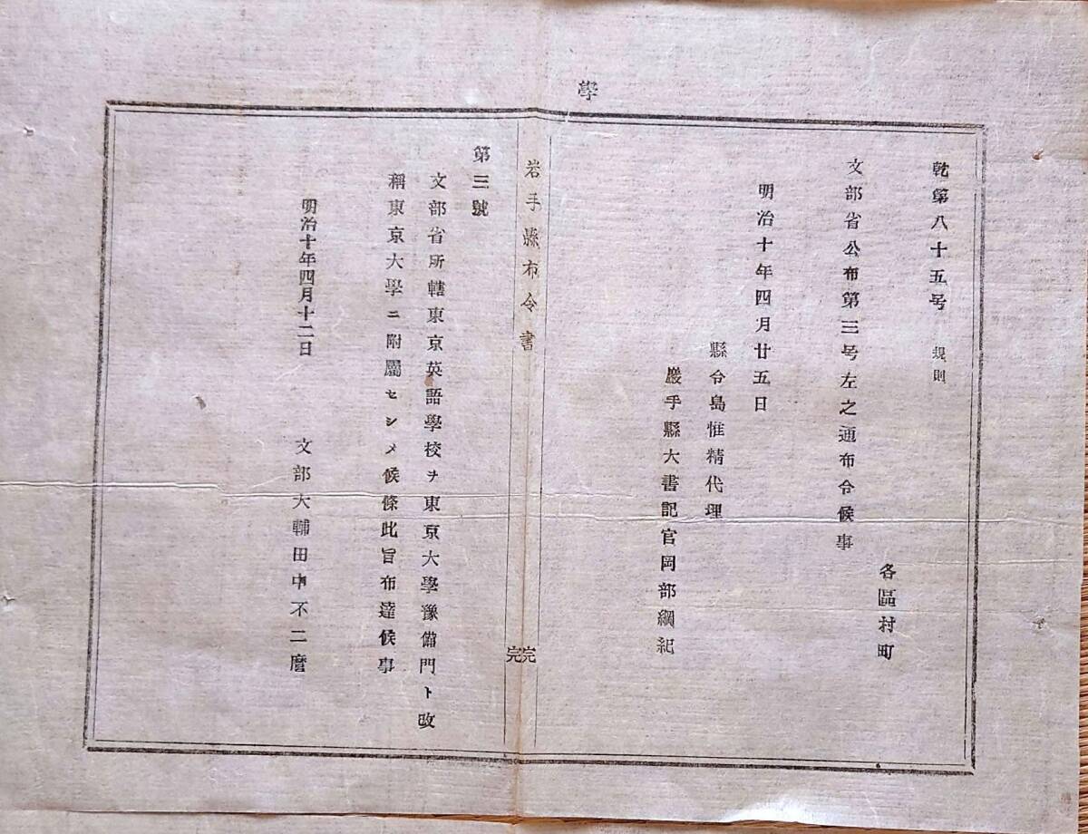 - f24052518〇明治布告布達 東京英語学校を東京大学予備門と改称 文部省 岩手県布令書 明治10年〇和本古書古文書