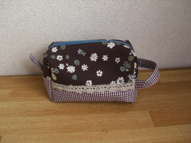 - ★ハンドメイド ポーチ こげ茶に小花&茶系ギンガムチェック