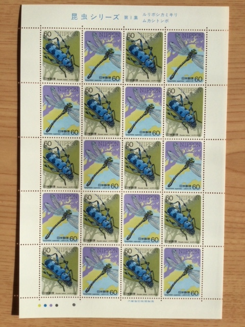 > 昆虫シリーズ 第1集 ルリボシカミキリ・ムカシトンボ 1シート(20面) 切手 未使用 1986年