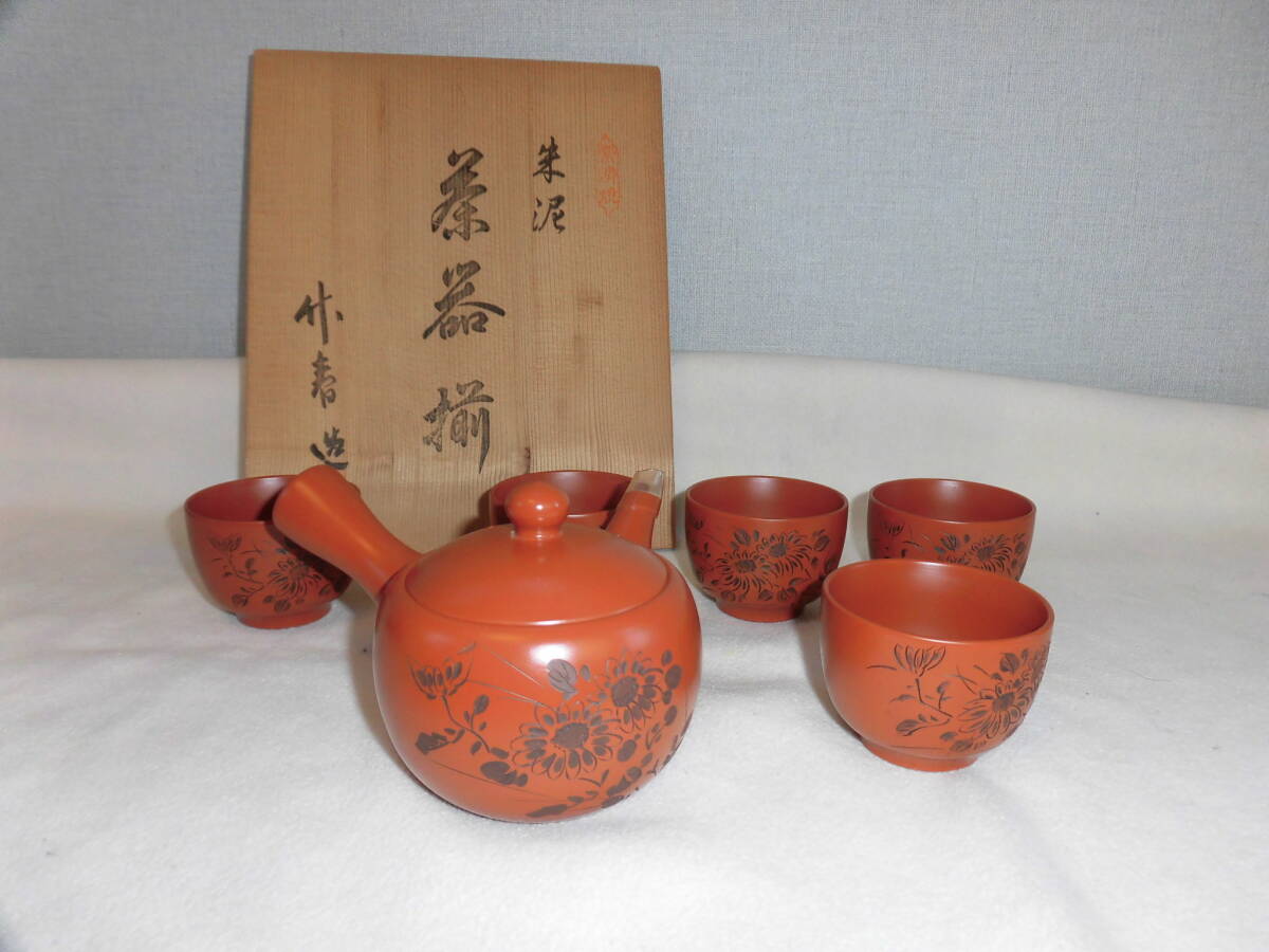 - 未使用木箱入り★常滑焼 竹春 造 朱泥 茶器揃 共箱 急須 湯呑 5客