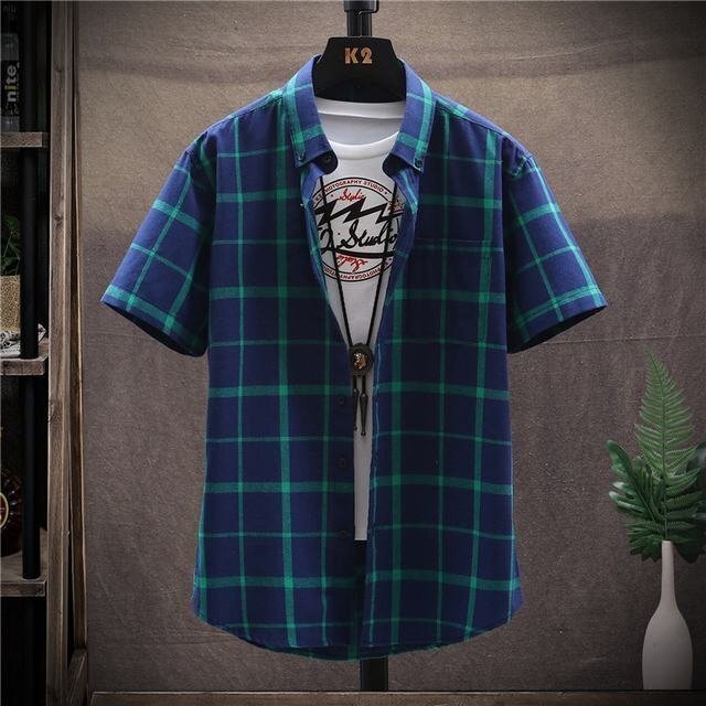 - メンズシャツ 夏物 白シャツ ゆったりシャツ 薄手 チェック柄シャツ トップス カジュアル 半袖シャツ グリーン M