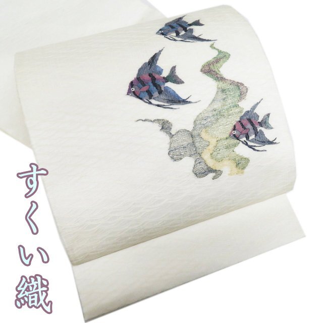 > 夏物 袋帯 中古 リサイクル 正絹 紬 カジュアル 仕立て上がり お太鼓柄 すくい織り 熱帯魚の図 白色 多色 きもの北條 A1031-12