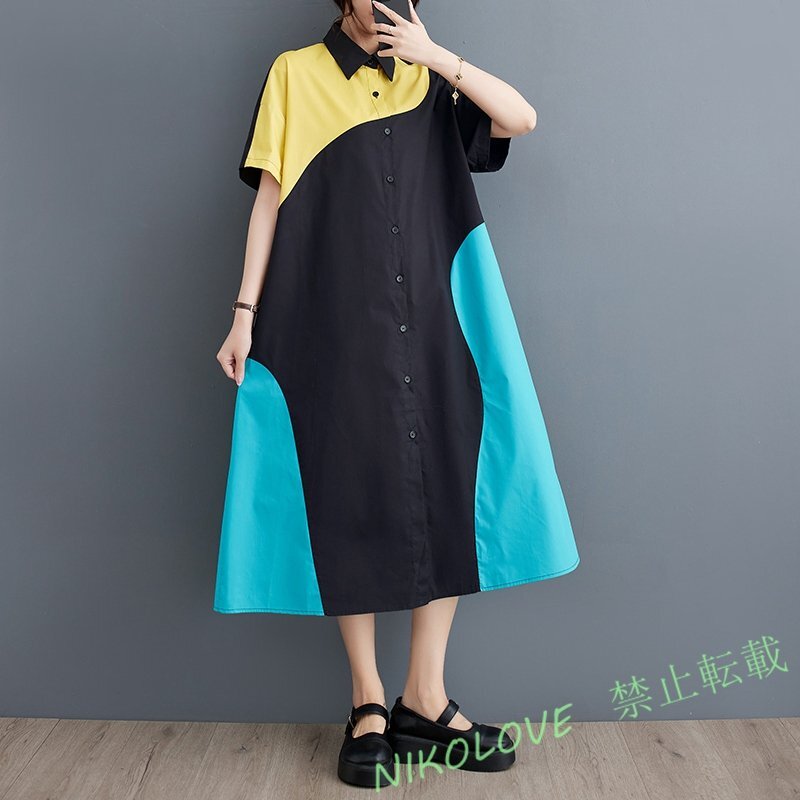 - 新品レディース ゆったり大きいサイズ カジュアル体型カバー プリント柄 配色半袖 ロングシャツワンピース 黒 LE494