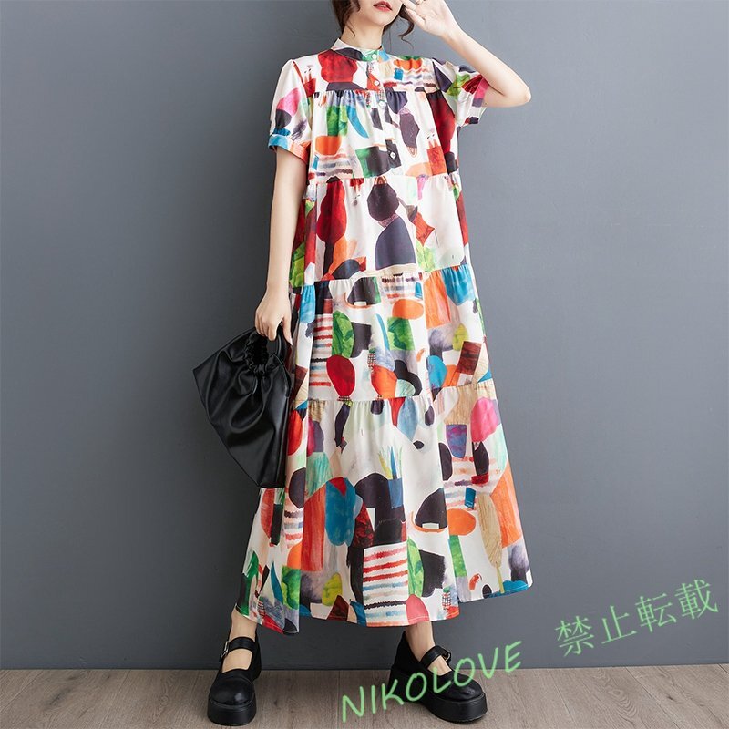 - 新品レディース エレガント 切り替え ゆったり大きいサイズ体型カバー 半袖ロングワンピース 白地に色柄 LE865