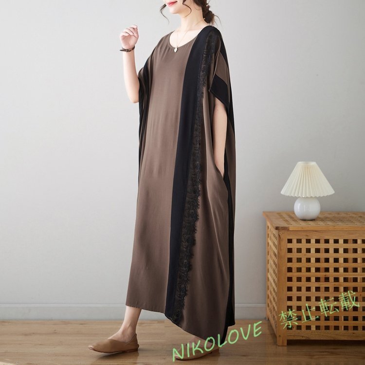 - 新品ゆったり大きいサイズ 丸首 カジュアル レースの縁取り 切り替え レトロ 半袖 ワンピース コーヒー LH366