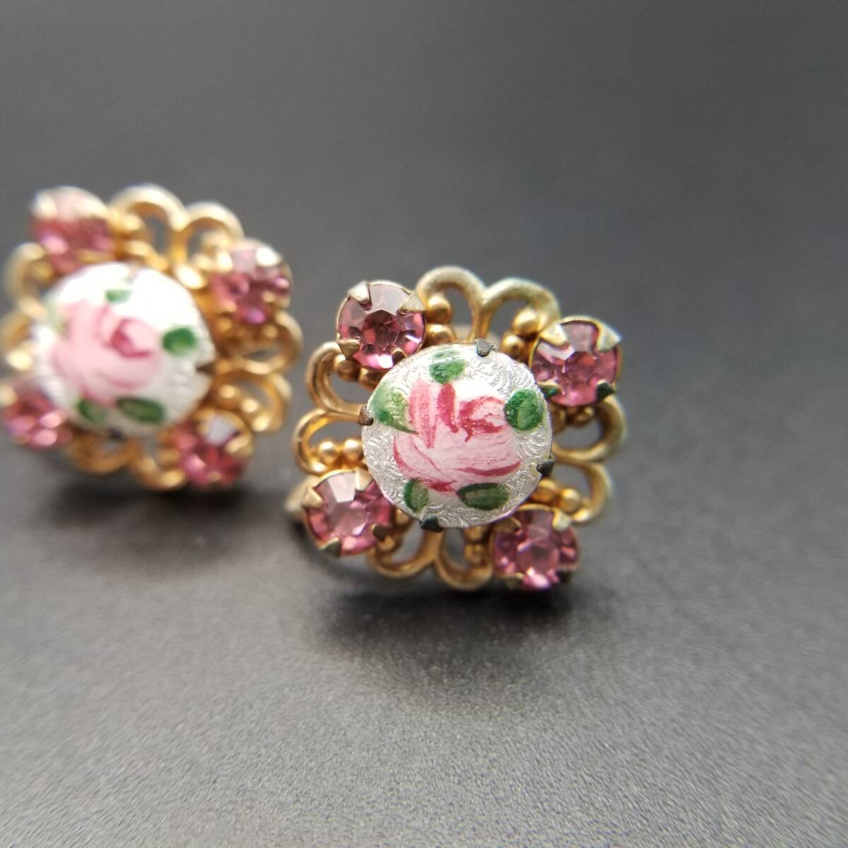 > 50'60's ヴィクトリアン ピンクの薔薇 ギロシェ ヴィンテージ イヤリング 上品 透かし ゴールドトーン フローラル Y16-Q