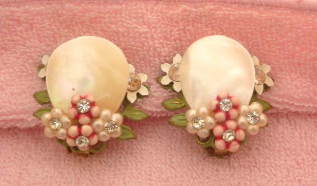 > ★美品激安★ヴィンテージコスチュームジュエリー天然シェル貝&白とピンクのメタル草花デザインハスケル風クリップイヤリング♪50's~欧米