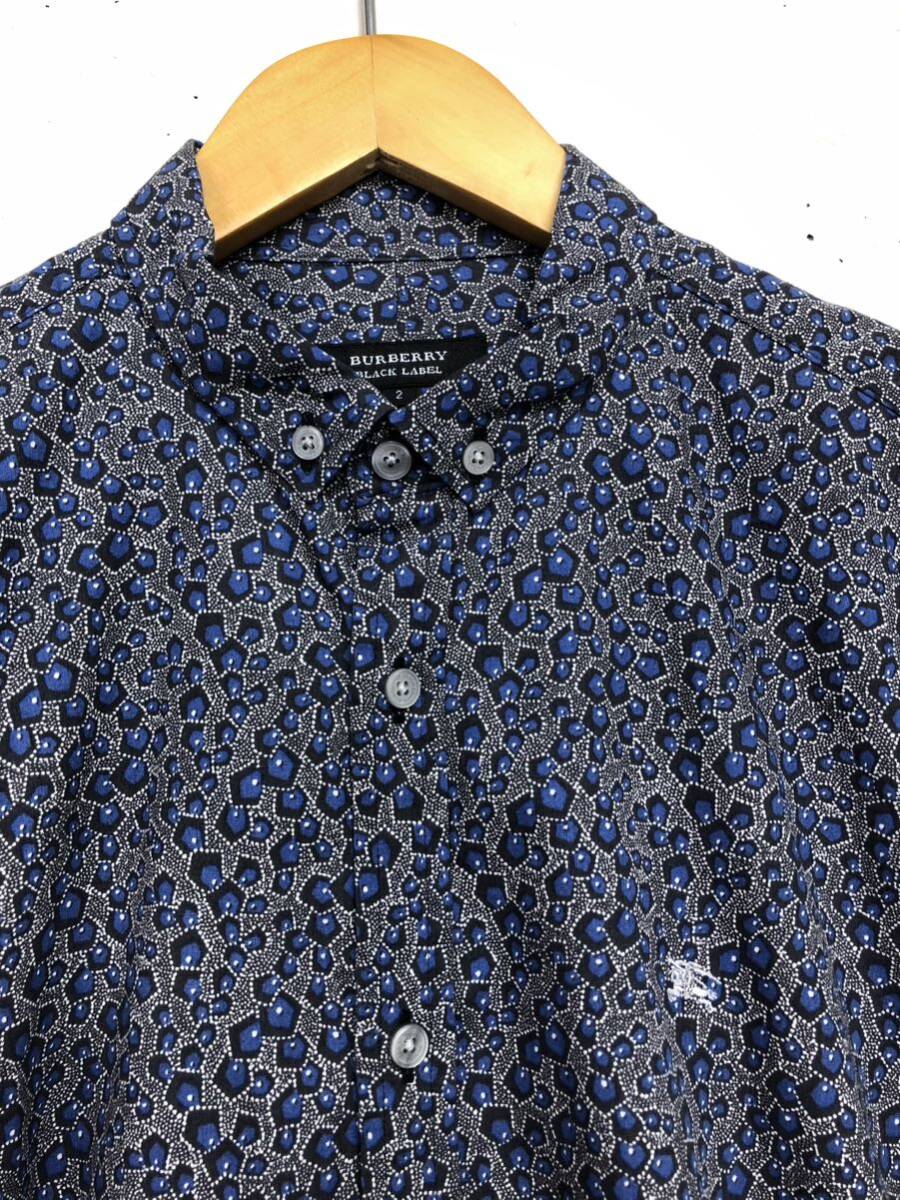 - 美品 BURBERRY BLACK LABEL 半袖シャツ 総柄 小襟ボタンダウン 紺系 2