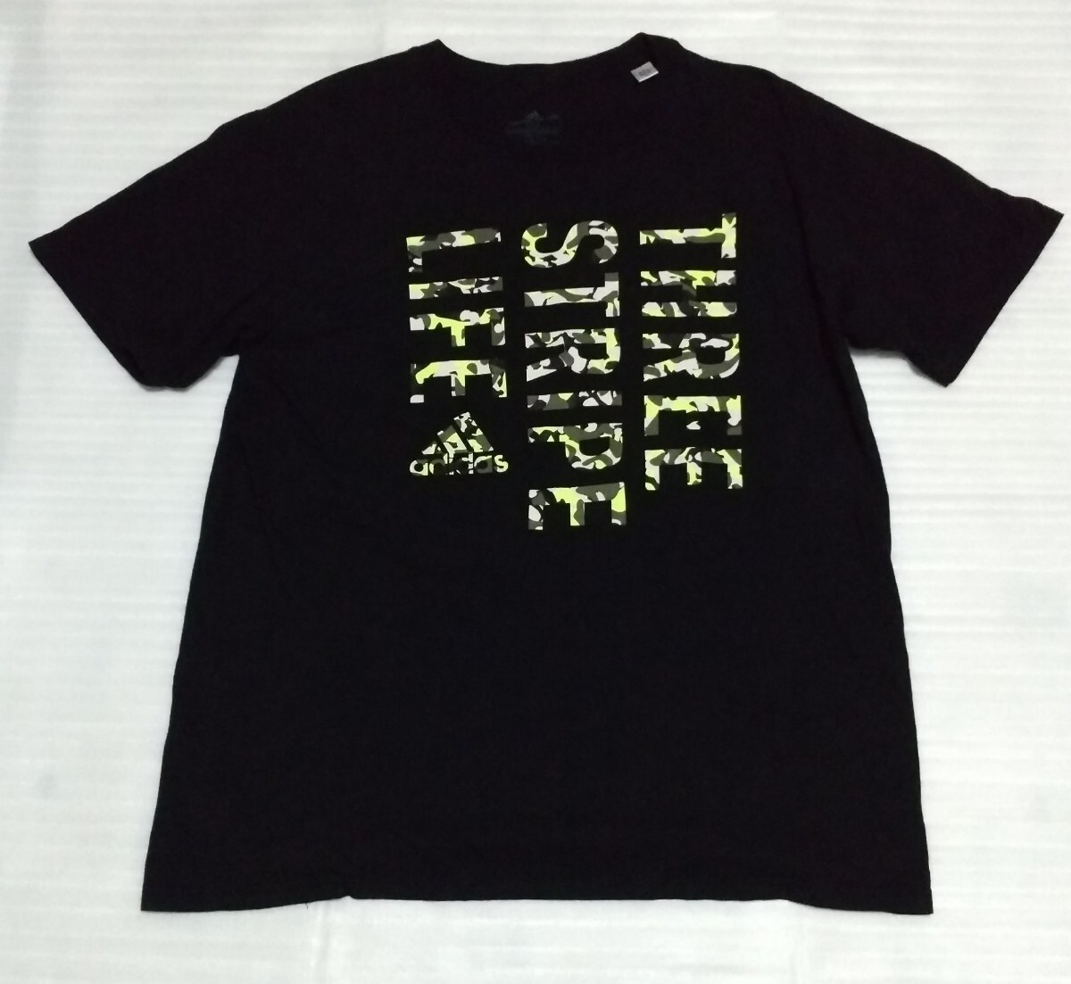 > ☆adidas.com アディダス サイズL 半袖Tシャツ THE GO-TO TEE スポーツ ウェア フアッション ティー黒ブラック迷彩色THREE STRIPE LIFE蛍光