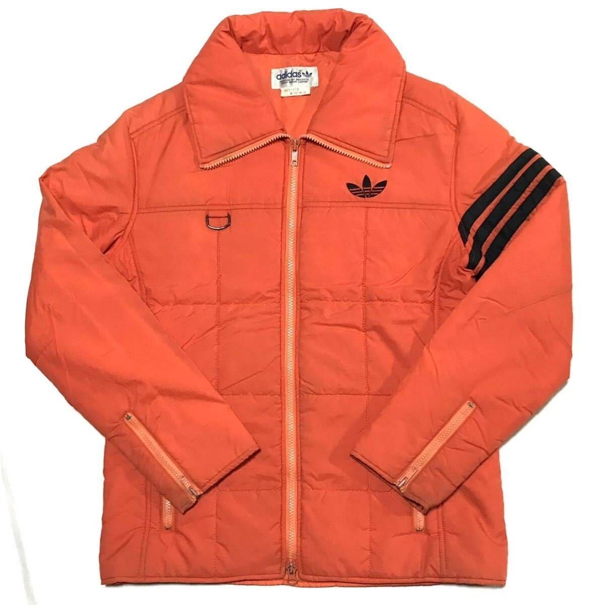 > 【80s】adidas アディダス デサント製 vintage ナイロンジャケット オレンジ トレフォイルロゴ 3ストライプ 中綿 正規品 レア スキー