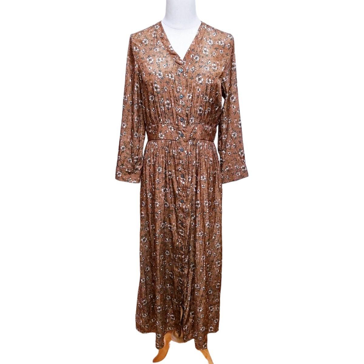 - 送料無料★良品★Y1593 le.coeur blanc ルクールブラン ロング ブラウスワンピース Vネック 長袖 レディース 38 M相当 ブラウン 花柄 総柄