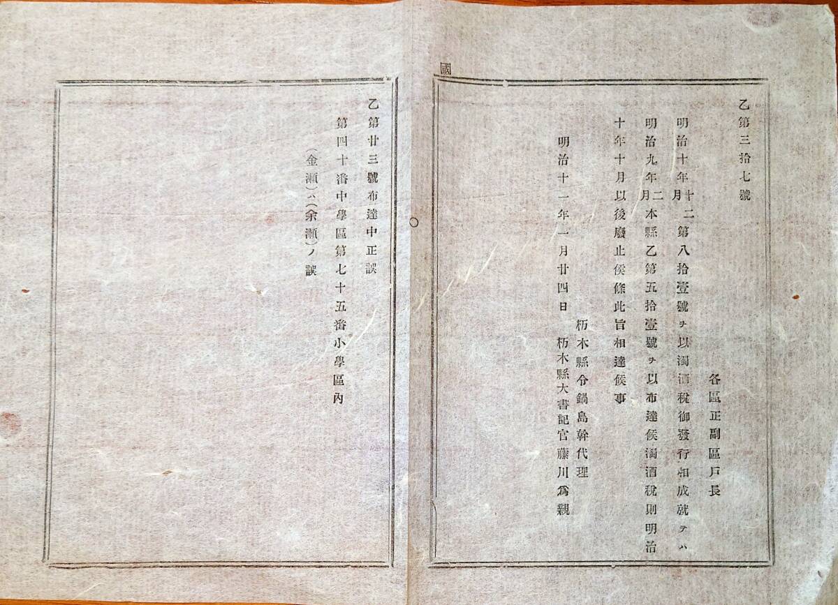 - f24070804〇明治布告布達 濁酒税発行 栃木県 明治11年〇和本古書古文書