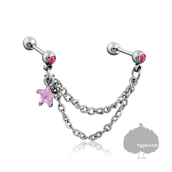 > YGG★新品チェーン付き ボディピアス スター付き ラインストーン 星 ピンク ボディピアス ステンレス 星 ストレートバーベル