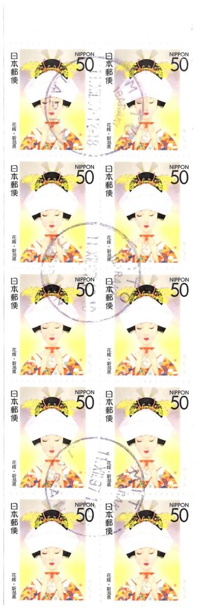 - ふるさと 平成9年 花嫁 50円10枚切手帳ペーン 実逓 欧文印 使用済 切手 静岡県