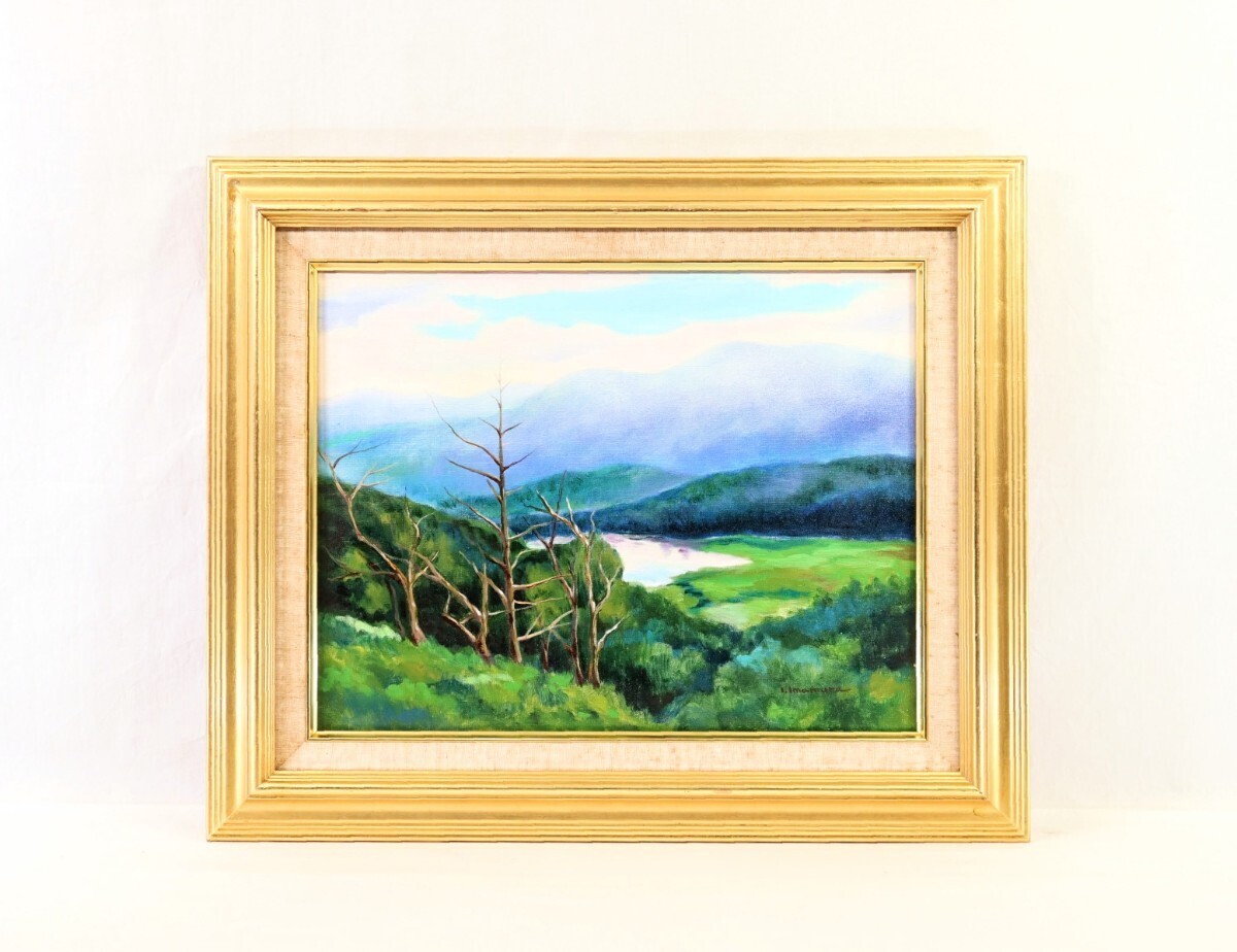- 真作 今村市久 油彩「八幡平より岩手山」画寸 F6 大阪府出身 創造美術協会会長 薄靄に包む岩手山と周辺の緑映 穏やかで静寂感伝わる 9404