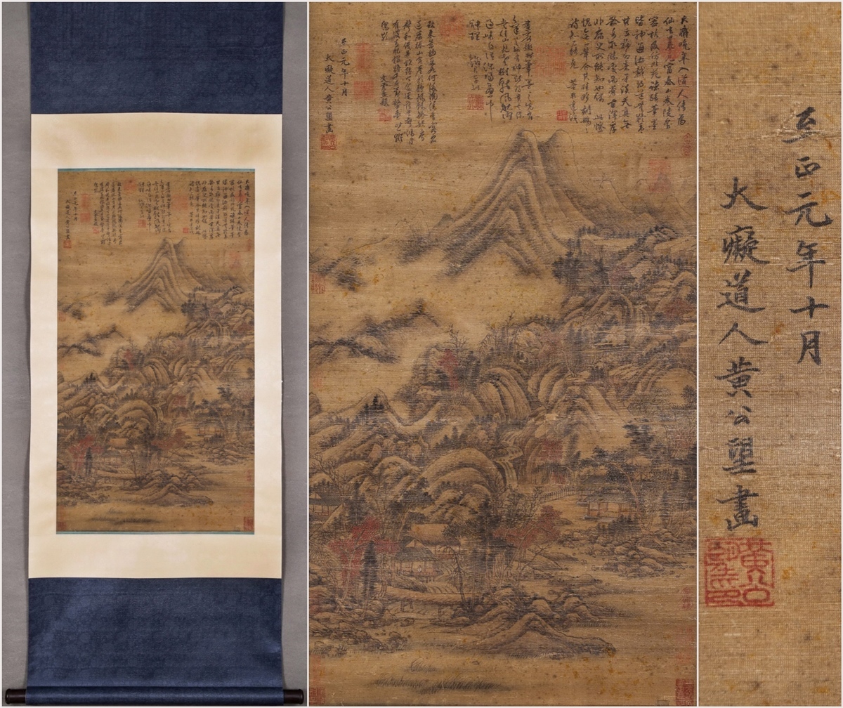 - 古美術 掛け軸 中国・元時代 「黄公望書」 絹本 【秋山林渓図】 立軸 書道 巻き物 真筆逸品 肉筆保証 唐物 古画 LT-24934