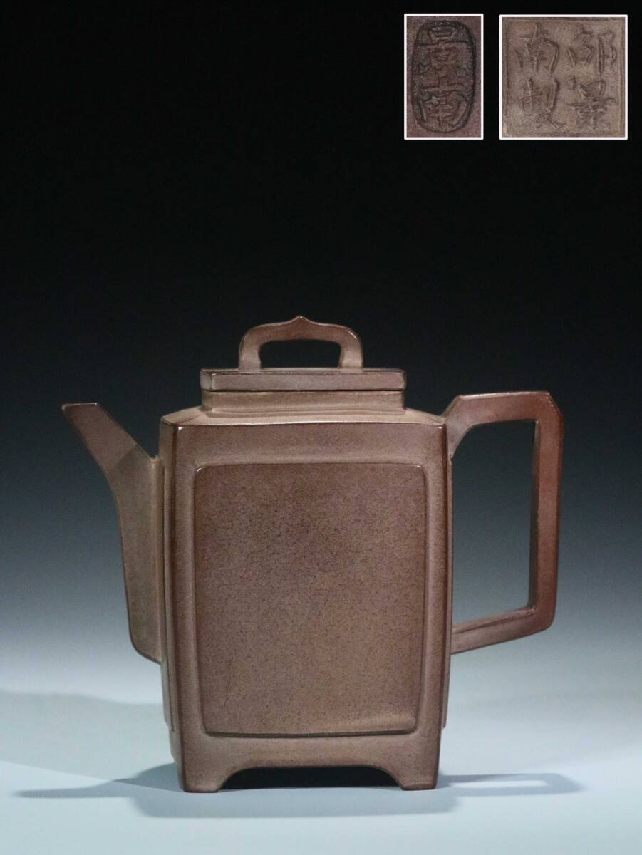 > 茶器 紫砂壷「邵景南」在銘 朱泥「開窓四足方壷」急須常滑 茶壷煎茶道具 唐物時代物 古陶芸 長12.2 cm、幅6.5 cm、高さ11.5 cm AU-7291