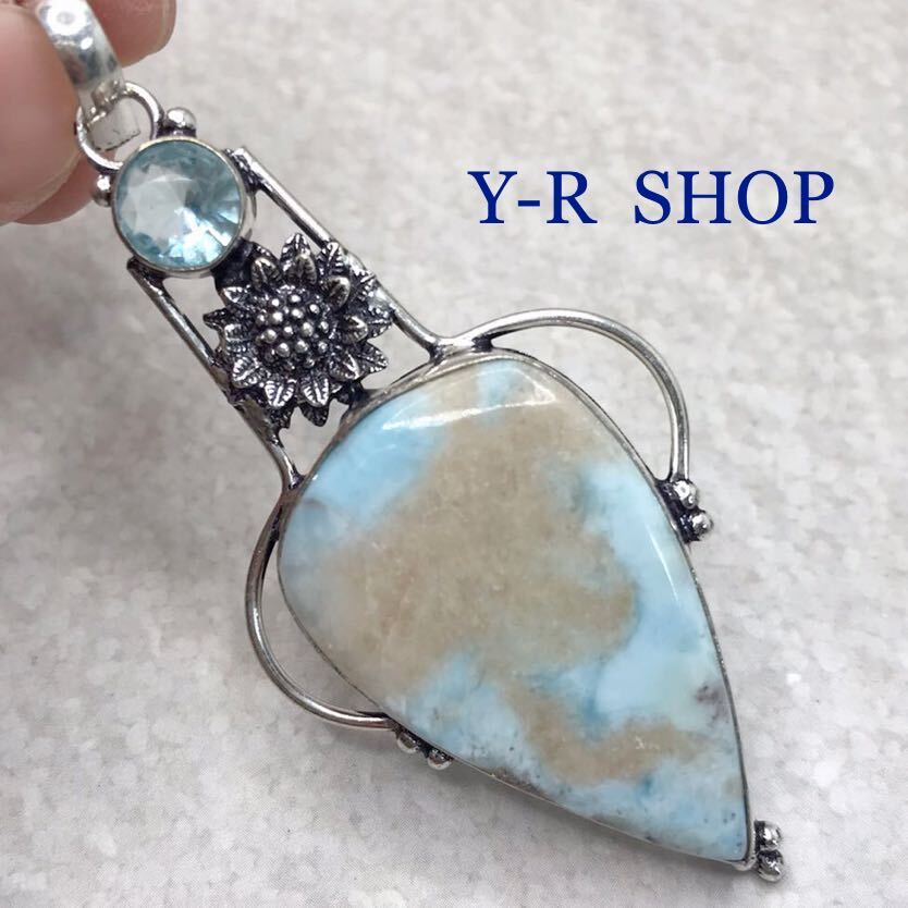 > 天然石★ラリマーとアクアマリンのお花デザインアンティーク調ペンダントトップ ★レディースメンズネックレスシルバー 925刻印アジアンY-R