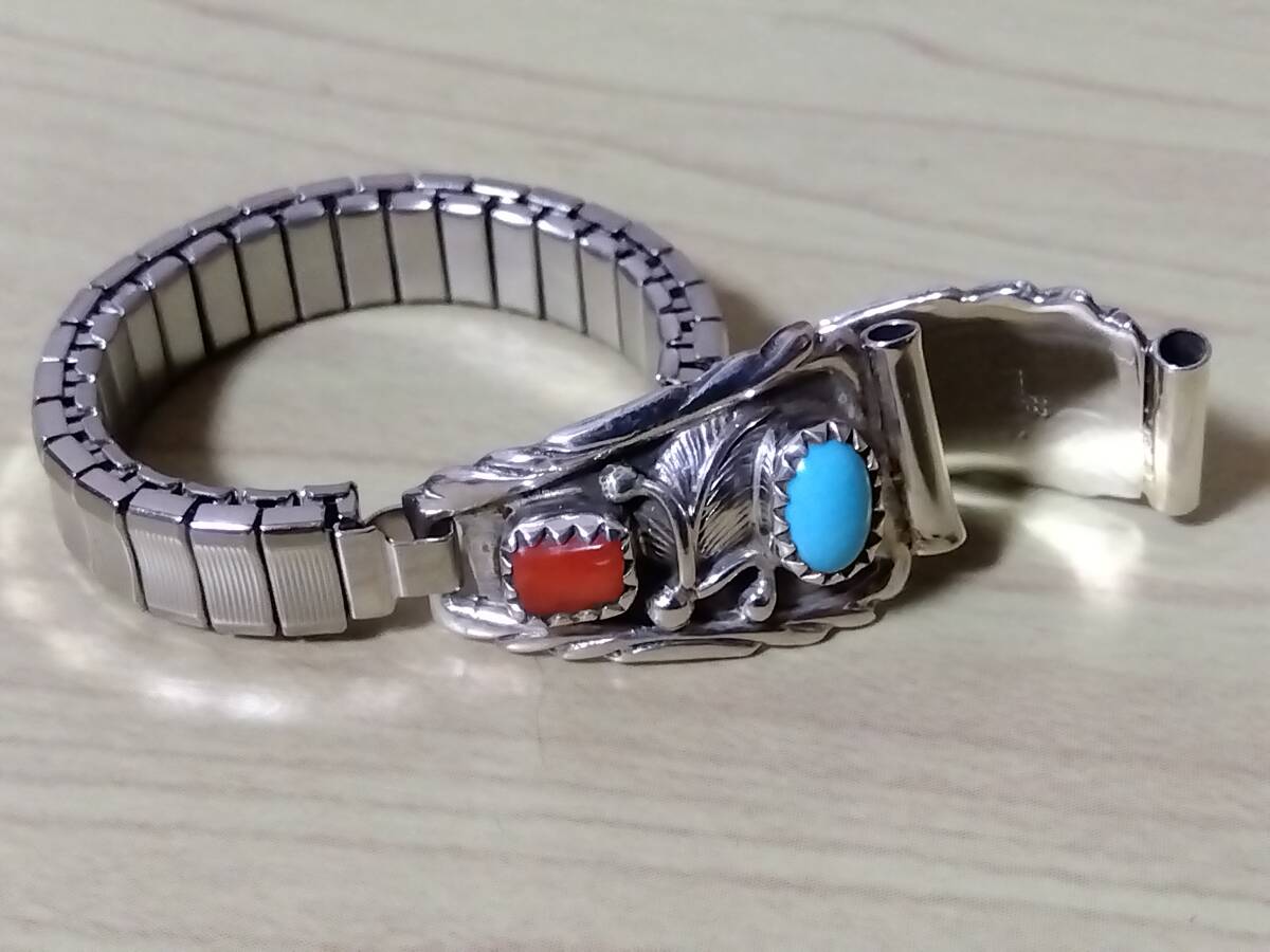 - 即決\6900 未使用品 シルバー925 インディアンジュエリー ターコイズ×コーラル 時計ベルト スターリングシルバー