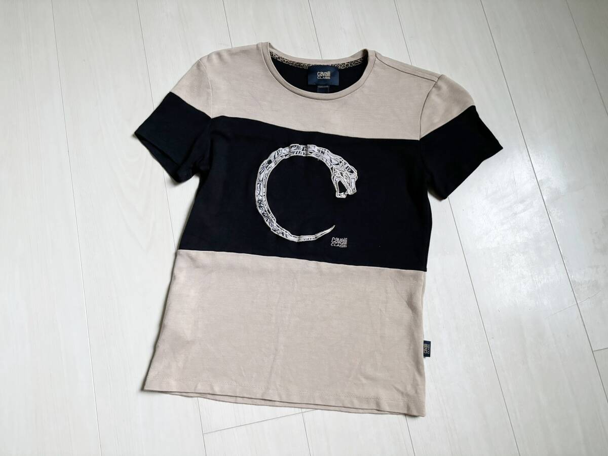> 美品 Class Roberto Cavalli クラス ロベルトカヴァリ Tシャツ 蛇 スネーク 刺繍 異素材切替 ロゴ刺繍 ツートン ベージュ 黒 ブラック △8