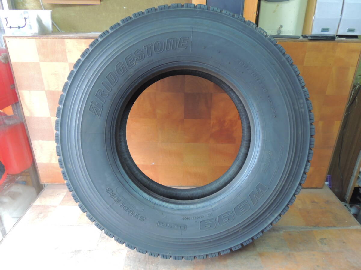 - E380 295/80R22.5 ブリヂストン W999 スタッドレス 1本 2022年製 トレッド、サイドウォール部分に傷有り 偏摩耗有り