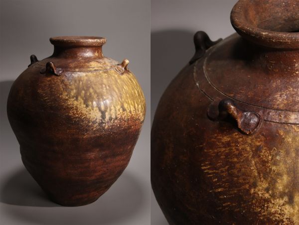 - 江戸初期 古越前 四耳壷 四耳子 壺 高さ38.5㎝ 花器 花瓶 花生 備前 丹波 信楽 BE793