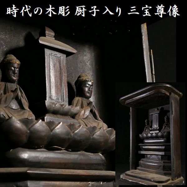 > 【 恵 #1269 】 時代の木彫 厨子入り 日蓮宗 法華宗 三宝尊像 一塔両尊 検:仏教美術/仏教工芸/仏像/仏様/置物