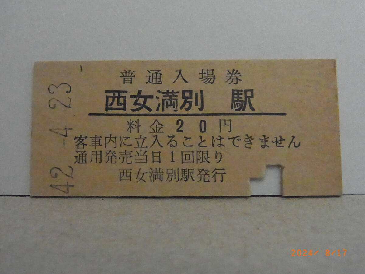 - 国鉄 石北本線 西女満別駅 入鋏済・20円普通入場券 昭42.4.23 0009 ★送料無料★