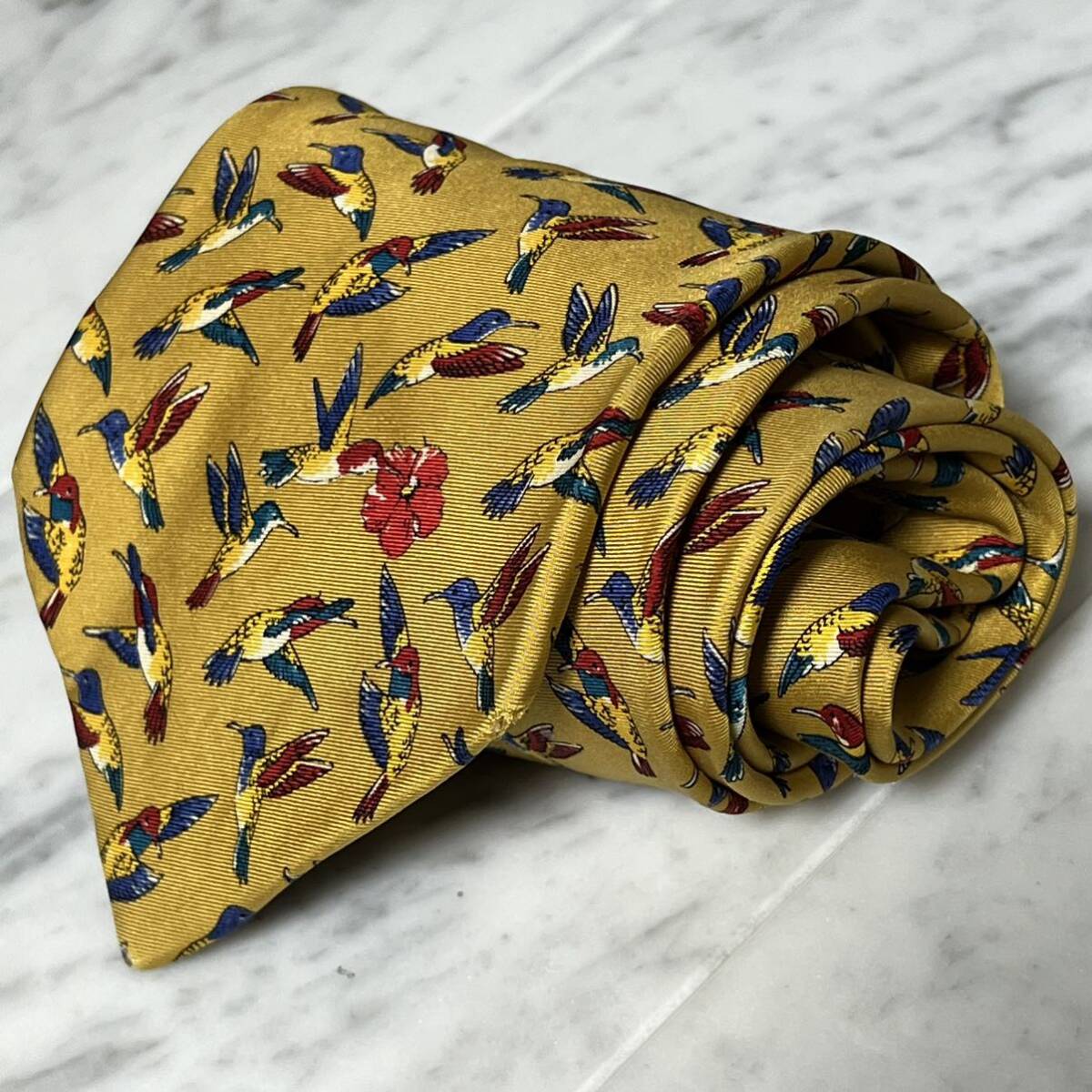 - 770円~ dunhill ネクタイ ブラウン系 黄土色 鳥 花柄 総柄 (GREEN B2)