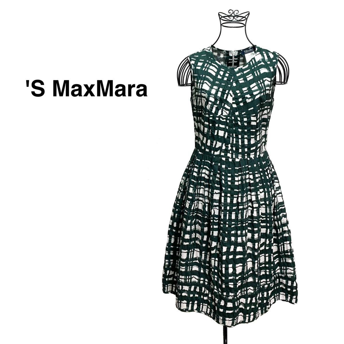 > ☆美品 'S MaxMara マックスマーラ Aライン チェック プリーツ ノースリーブ ワンピース ドレス 緑白 リゾートスタイル フレア バカンス