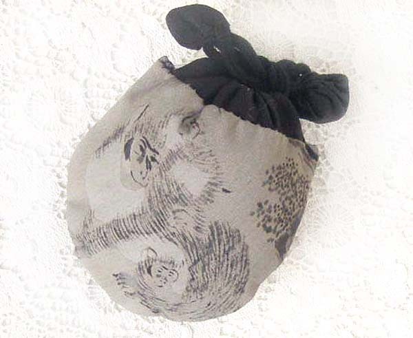 - 古布591 ソフト小袋・根付袋・絹 (竹林の賢人や猿の親子) 時代着物地