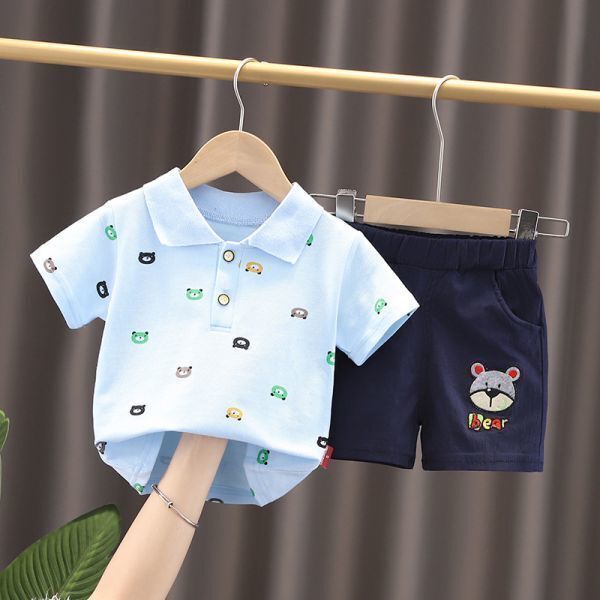 - ♪mineka・新品・セール♪夏着 ベビー上下セット 半袖 クマ柄ポロシャツ・ショーパンツ カジュアル 綿製 普段着 ブルー 80CM 211651/2T