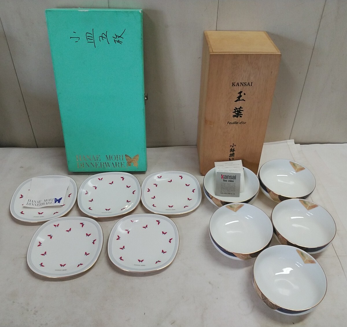 > 未使用 陶器 お皿セット【 HANAE MORI DINNER WARE 小皿5客 14×14cm・KANSAI 玉葉 小鉢揃い 5客 φ12.2×5cm 】未使用在庫品 元箱付