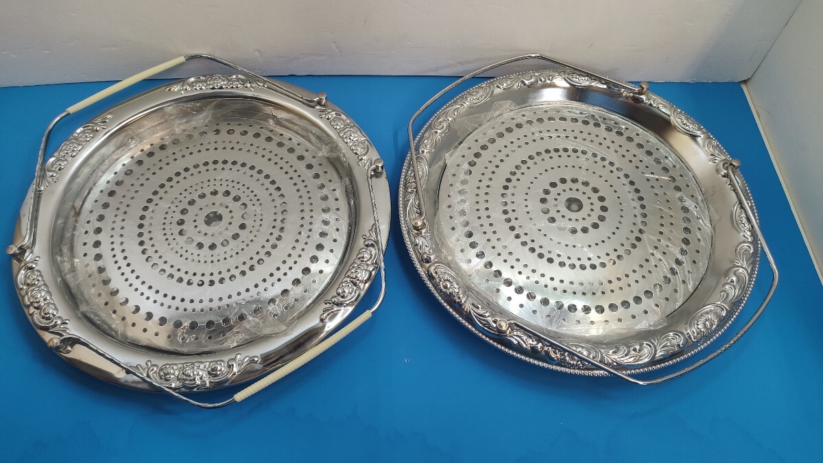 - ★トレー 2枚セット 取っ手付き トレイ ステンレス 円形 フルーツ盛り皿 水切りプレート レトロ 喫茶店 オードブル