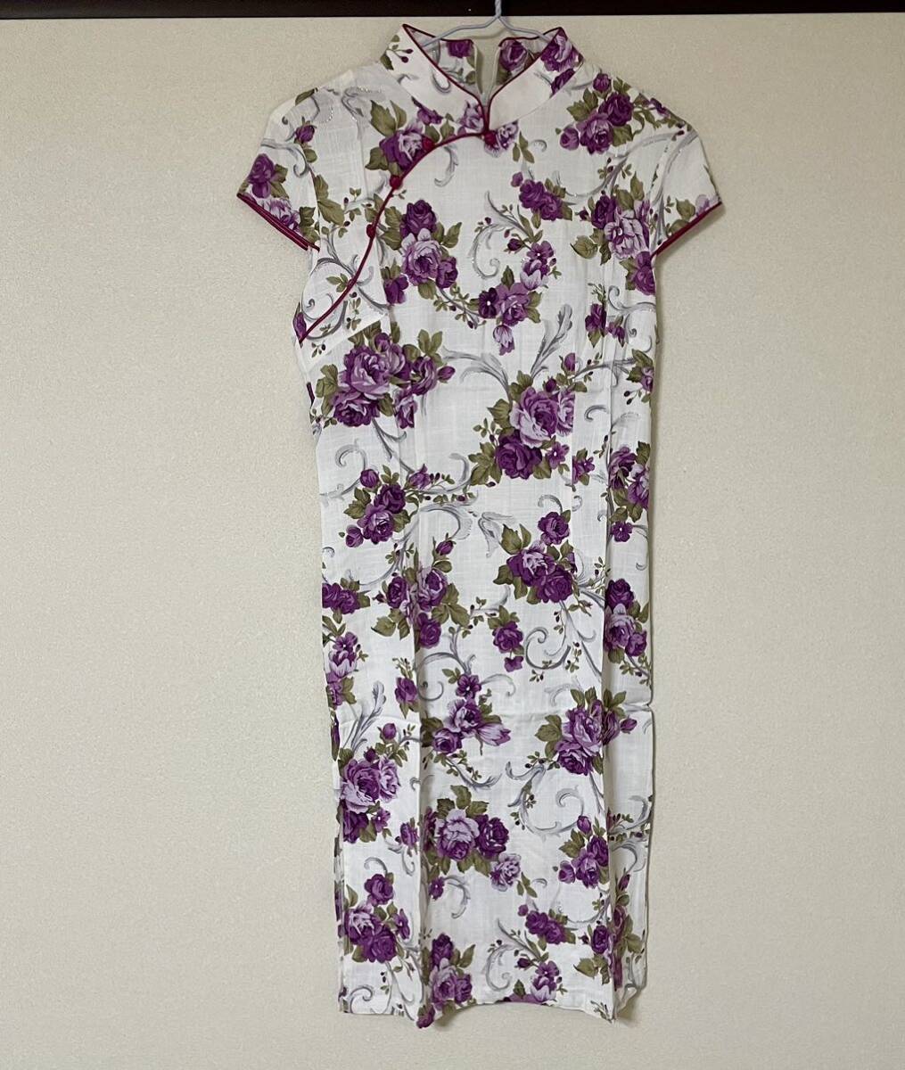 - チャイナドレス スカート ドレス ストレッチあり お花 パープル ホワイト フォーマル カジュアル コスプレ衣装にも ハローウィン