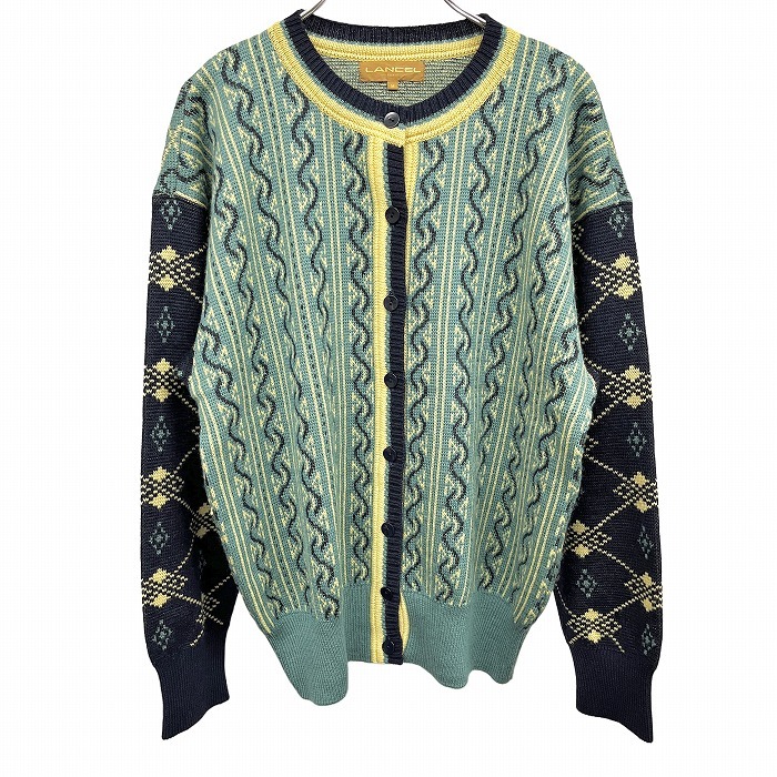 - ランセル LANCEL ウールカットソー カーディガン 丸首 ボタン留め 総柄 長袖 ロングスリーブ 毛100% M 紺×緑×黄 レディース