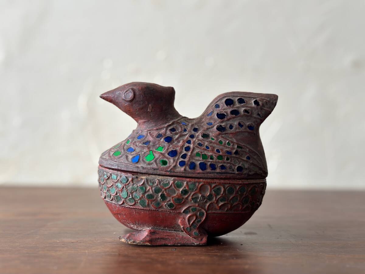- ビンテージ タイ ハンドメイド インテリア ディスプレイ 器 小物入れ オブジェ 置物 木製 古道具 鳥 鶏 ミラーワーク
